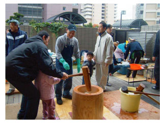 今年はスポーツ懇親会とお餅つき大会を。11月26日のお餅つき大会はマンションの中庭に大きな臼が用意され、子ども達が順番に大きな杵でペッタンコ、ペッタンコと楽しそう。