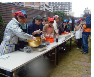 お母さんたちが、搗き上がったお餅を食べやすいサイズの黄粉餅や餡コロ餅にして配り、前夜から役員の家庭で作った豚汁を持ち寄りみんなで舌鼓を。当日の参加者は200名を越えて大盛況!!