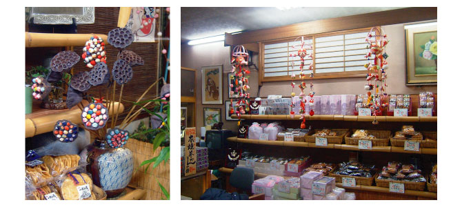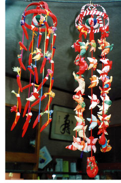 つるし飾りは昔、お雛さまを飾れない家庭で、子どもの成長を祝う為に端切れで丁寧に作られた手作り雛飾りとして初節句を祝ったとの言い伝えがあるそうですが、可愛い飾りは経済的な余裕の有無に関わらず心なごませる華やかさがあります。西村さんはお孫さんの初節句の度にお雛様を送っていましたが、もう、飾る場所が無い…と言う事で、「雛のつるし飾り」をと思い立ち、手作りの可愛いつるし飾りをお祝いにされた事がきっかけで、毎年、お忙しい中をコツコツと作り貯め、お正月、おひな祭りの時期にお店に飾り、お客様や道行く方に楽しんで貰っています。
