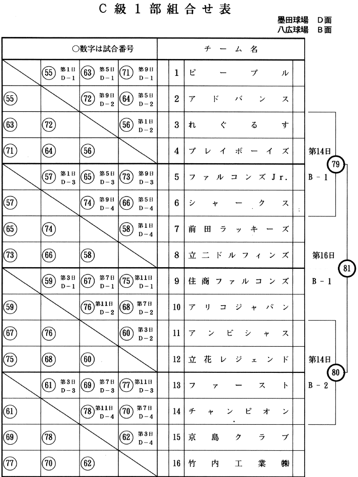 ピープル/アドバンス/れぐるす/プレイボーイズ/ファルコンズJr./シャークス/前田ラッキーズ/立二ドルフィンズ/住商ファルコンズ/アリコジャパン/アンビシャス/立花レジェンド/ファースト/チャンピオン/京島クラブ/竹内工業(株)