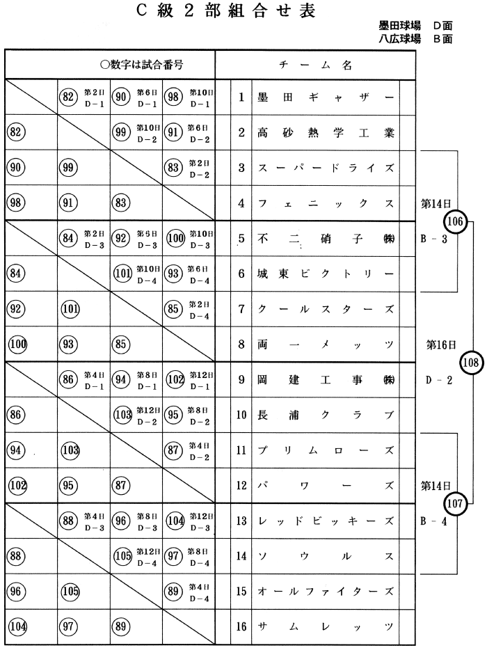 墨田ギャザー/高砂熱学工業/スーパードライズ/フェニックス/不二硝子(株)/城東ビクトリー/クールスターズ/両一メッツ/岡建工事(株)/長浦クラブ/プリムローズ/パワーズ/レッドビッキーズ/ソウルス/オールファイターズ/サムレッツ