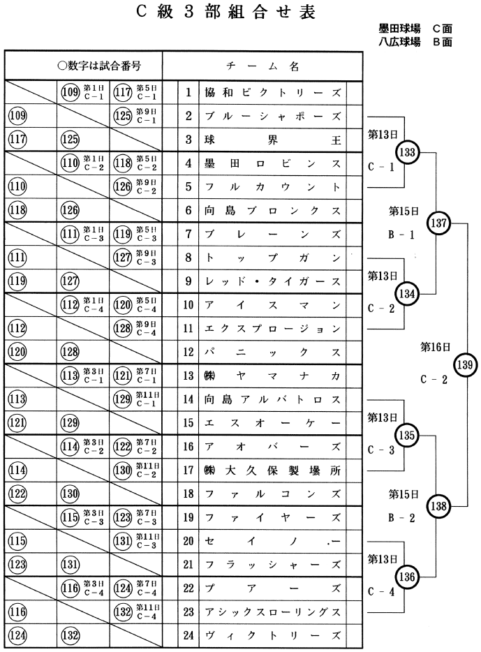 協和ビクトリーズ/ブルーシャポーズ/球界王/墨田ロビンス/フルカウント/向島ブロンクス/ブレーンズ/トップガン/レッド・タイガース/アイスマン/エクスプロージョン/パニックス/(株)ヤマナカ/向島アルバトロス/エスオーケー/アオバーズ/(株)大久保製曇所/ファルコンズ/ファイヤーズ/セイノー/フラッシャーズ/プアーズ/アシックスローリングス/ヴィクトリーズ