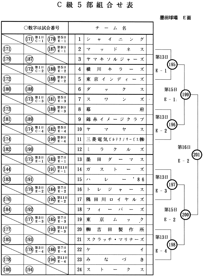 シャイニング/マッドネス/ヤマキソルジャーズ/横川キラーズ/東京インディーズ/ダックス/スワンズ/幕府/錦糸町イメージクラブ/ヤマヤス/三菱電機ビルテクノサービス(株)/ミラクルズ/墨田ダーマス/ガストーズ/ハレー'86/トレジャーズ/隅田川ロイヤルズ/フィーバーズ/東京ムック/(株)吉田製作所/スクラッチ・マリナーズ/ケイ/みなづき/ストークス