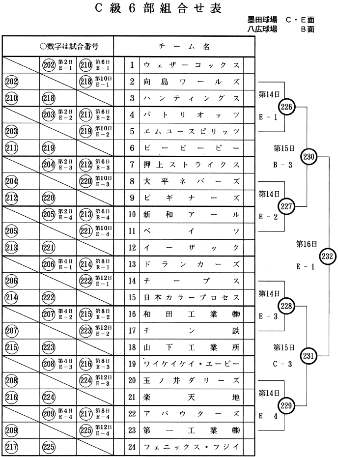 ウェザーコックス/向島ワールズ/ハンティングス/パトリオッツ/エムユースピリッツ/ビービーピー/押上ストライクス/太平ネバーズ/ビギナーズ/新和アール/ベイソ/イーザック/ドランカーズ/チープス/日本カラープロセス/和田工業(株)/チン鉄/山下工業所/ワイケイケイ・エーピー/楽天地/アバウターズ/第一工業(株)/フェニックス・フジイ