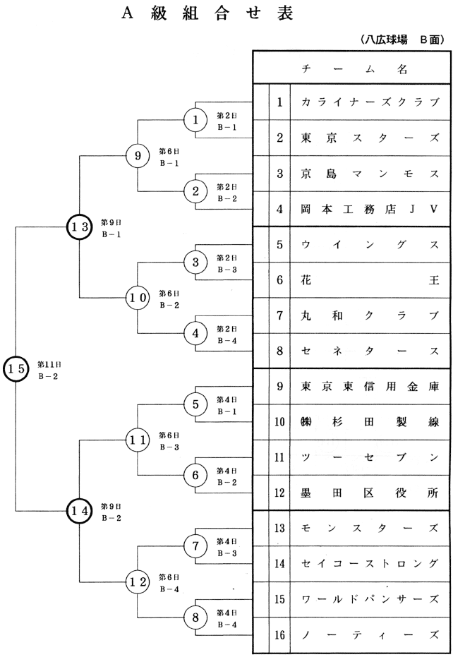 カライナーズ/東京スターズ/京島マンモス/岡本工務店JV/ウイングス/花王/丸和クラブ/セネタース/東京東信用金庫/(株)杉田製線/ツーセブン/墨田区役所/モンスターズ/セイコーストロング/ワールドパンサーズ/ノーティーズ