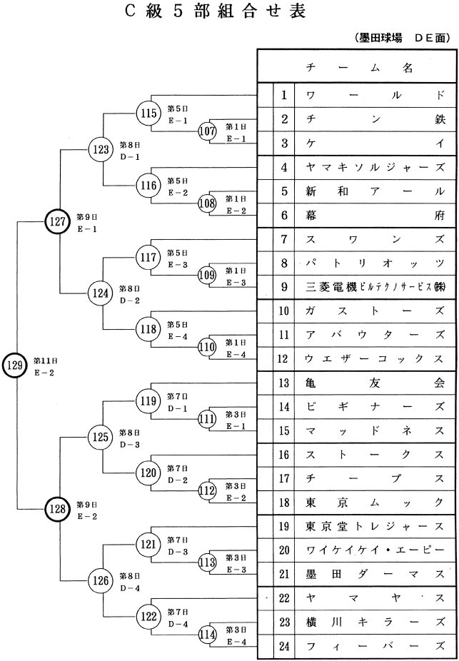 ワールド/チン鉄/ケイ/ヤマキソルジャーズ/新和アール/幕府/スワンズ/パトリオッツ/三菱電機ビルテクノサービス(株)/ガストーズ/アバウターズ/ウエザーコックス/亀友会/ビギナーズ/マッドネス/ストークス/チープス/東京ムックス/東京堂トレジャーズ/ワイケイケイ・エーピー/墨田ダーマス/ヤマヤス/横川キラーズ/フィバーズ