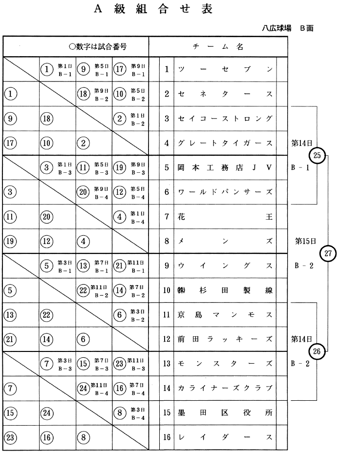 ツーセブン/セネタース/セイコーストロング/グレートタイガース/岡本工務店JV/ワールドパンサーズ/花王/メンズ/ウイングス/(株)杉田製線/京島マンモス/前田ラッキーズ/モンスターズ/カライナーズクラブ/墨田区役所/レダーズ