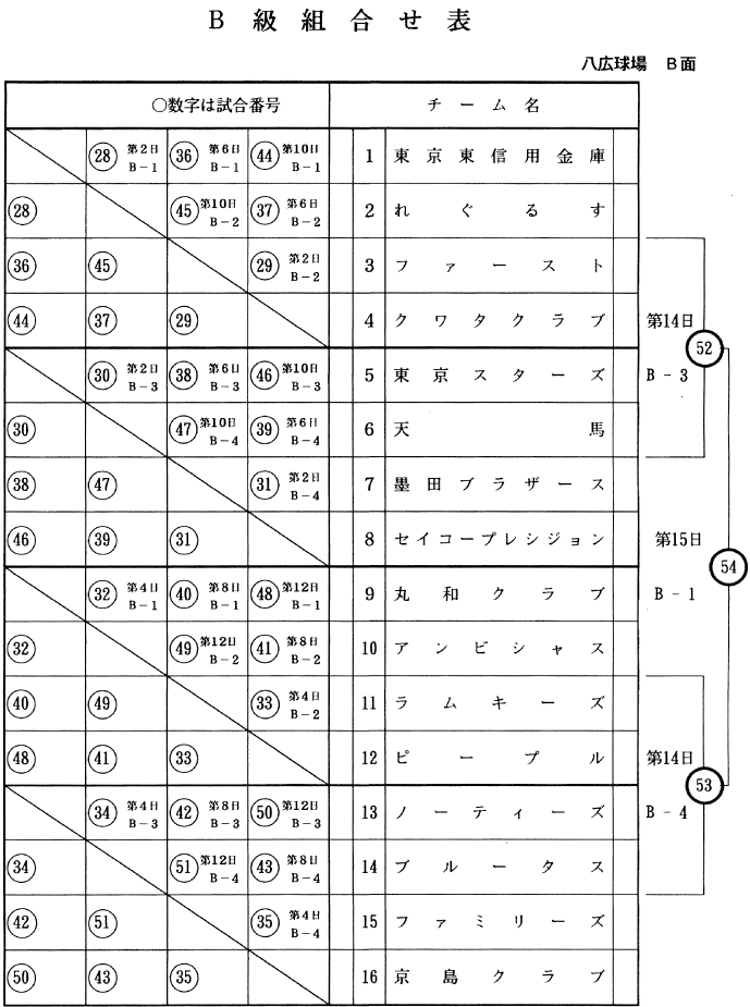 東京東信用金庫/れぐるす/ファースト/クワタクラブ/東京スターズ/天馬/墨田ブラザーズ/セイコープレシジョン/丸和クラブ/アンビシャス/ラムキーズ/ピープル/ノーティーズ/ブルータス/ファミリーズ/京島クラブ