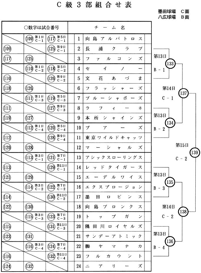 協和ビクトリーズ/ブルーシャポーズ/球界王/墨田ロビンス/フルカウント/向島ブロンクス/ブレーンズ/トップガン/レッド・タイガース/アイスマン/エクスプロージョン/パニックス/(株)ヤマナカ/向島アルバトロス/エスオーケー/アオバーズ/(株)大久保製曇所/ファルコンズ/ファイヤーズ/セイノー/フラッシャーズ/プアーズ/アシックスローリングス/ヴィクトリーズ