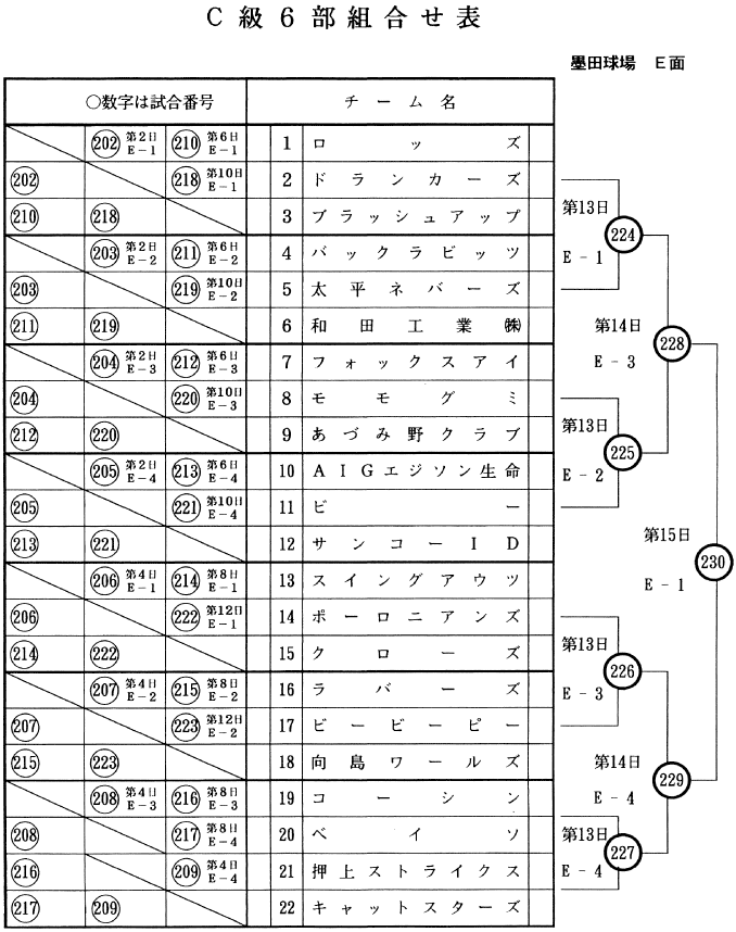 ウェザーコックス/向島ワールズ/ハンティングス/パトリオッツ/エムユースピリッツ/ビービーピー/押上ストライクス/太平ネバーズ/ビギナーズ/新和アール/ベイソ/イーザック/ドランカーズ/チープス/日本カラープロセス/和田工業(株)/チン鉄/山下工業所/ワイケイケイ・エーピー/楽天地/アバウターズ/第一工業(株)/フェニックス・フジイ
